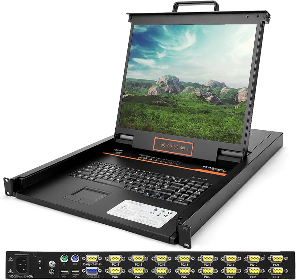 1U Rack Mount KVM Console, 16 Port VGA KVM Switch w/19'' LCD Monitor,1U LCD KVM Console Fit 19'' Rack,Integrated with Keyboard+Touchpad+KVM Switch Drawer+16 KVM Cable,Support OSD/Hotkey/Button Switch