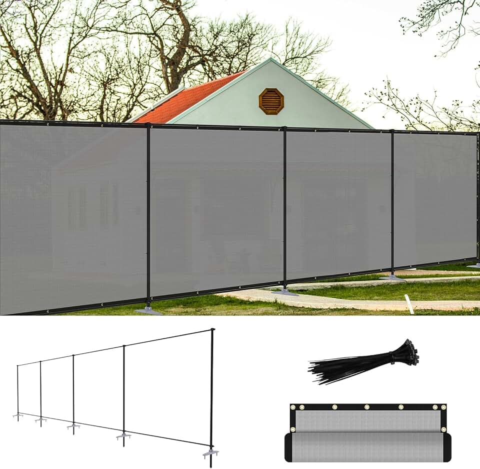Outdoor Privacy Fence with Iron Poles Rails Mesh Shade Net Cover Temporary Fencing for Patio Backyard Chicken Metal Fence with Spikes, 6'x24',Light Grey