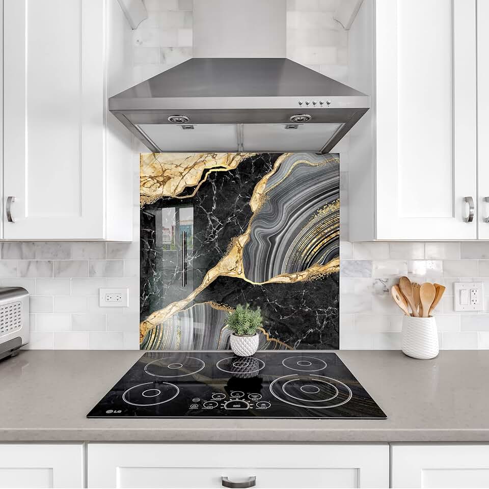 Myphotostation Tempered Glass Splashback 30Wx27.5H'-Black Golden Backsplash Design Cooker Gold Backsplash Panel Glass Splashback for Bathroom Panel Design Marble Splashback for Stove Kitchen