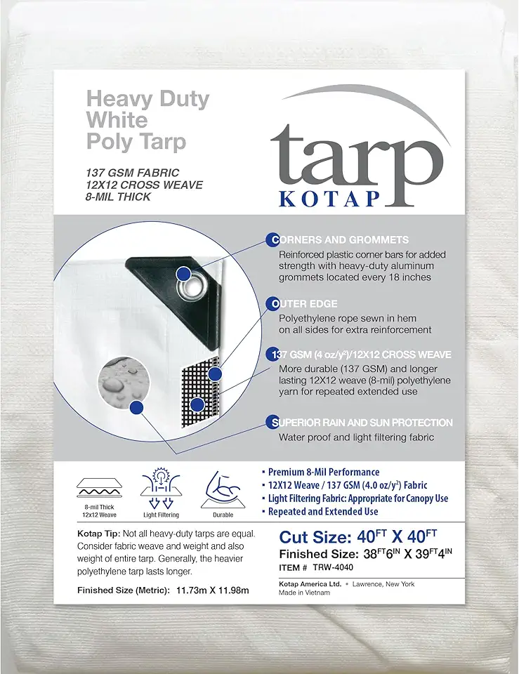 Kotap 40 x 40 Ft. Heavy-Duty Protection/Coverage Tarp, Superior Weave for Greater Longevity 8-mil, Multi-Use, Waterproof, White, 1-Pack (TRW-4040)