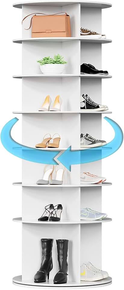 7 Tier Rotating Shoe Rack Tower, 360° Revolving Free Standing Shoe Organizer High Bottom Design Shoe Tower Spinning Storage Lazy Susan Multifunctional Rotate Shoes Closet Organization (White)
