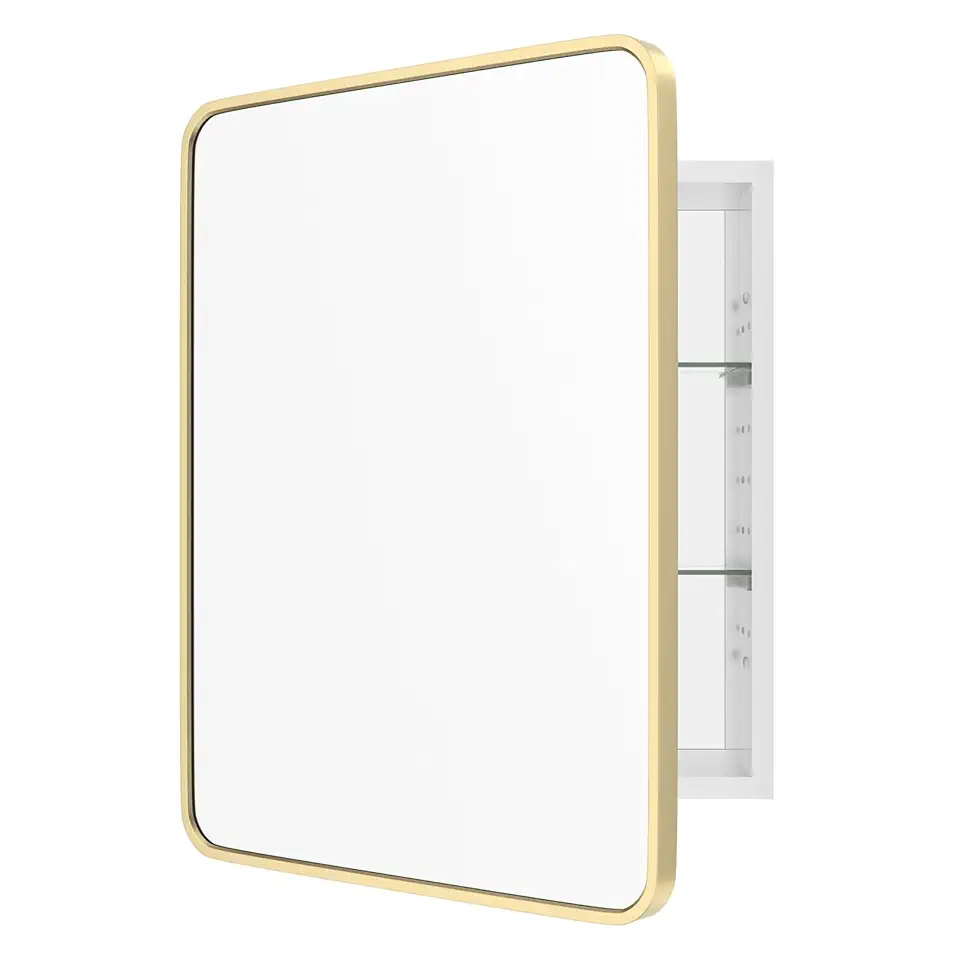WallBeyond Bathroom Medicine Cabinet with Mirror, 22x28 Inch Gold Recessed Medicine Cabinet with Round Corner Aluminum Alloy Metal Framed, Single Door Modern MedicineMabinet with Storage