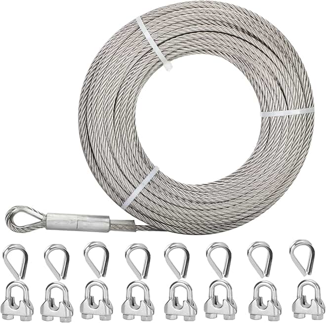 5/16 Stainless Steel Cable 200FT, 7x19 Strands Wire Rope Cable, Wire Rope with 9000 lbs Breaking Strength, Stainless Steel Wire Rope with M8 Clips Clamp and Thimbles for Boat Lifting Winch Cable