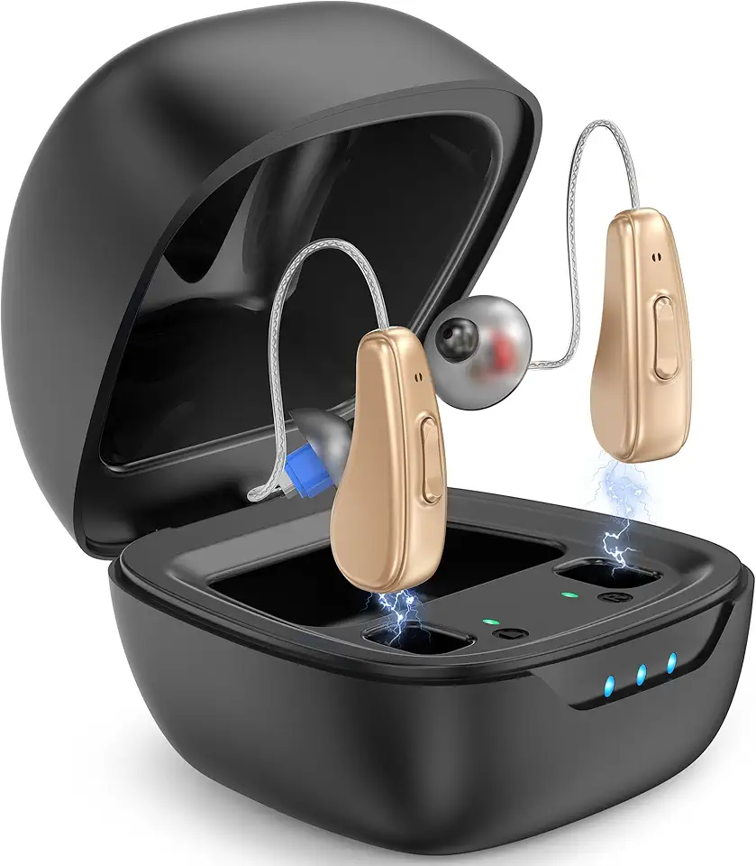 Rechargeable Hearing Aids for Seniors Adults, Advanced Multi Channel Digital BTE Hearing Assist, with Recycle Charging Case for 125 Hrs Backup Power, Auto-On/Off, Pair, Lucid508-Beige