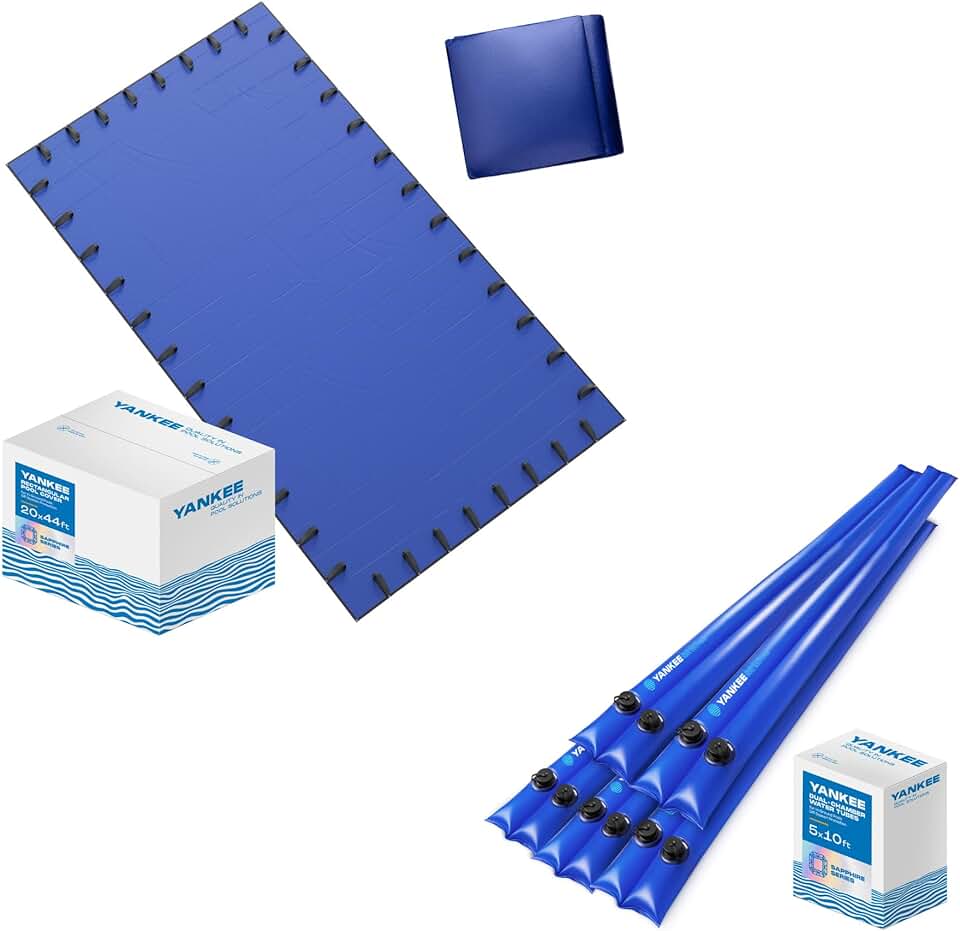 Yankee Sapphire Series: Extra Thick & Durable Inground Pool Cover for 20x44 ft Rectangular Pools + 10’ Dual Chamber Pool Water Tubes (5 Pack) | Pool Cover Weights for Inground Pool Cover