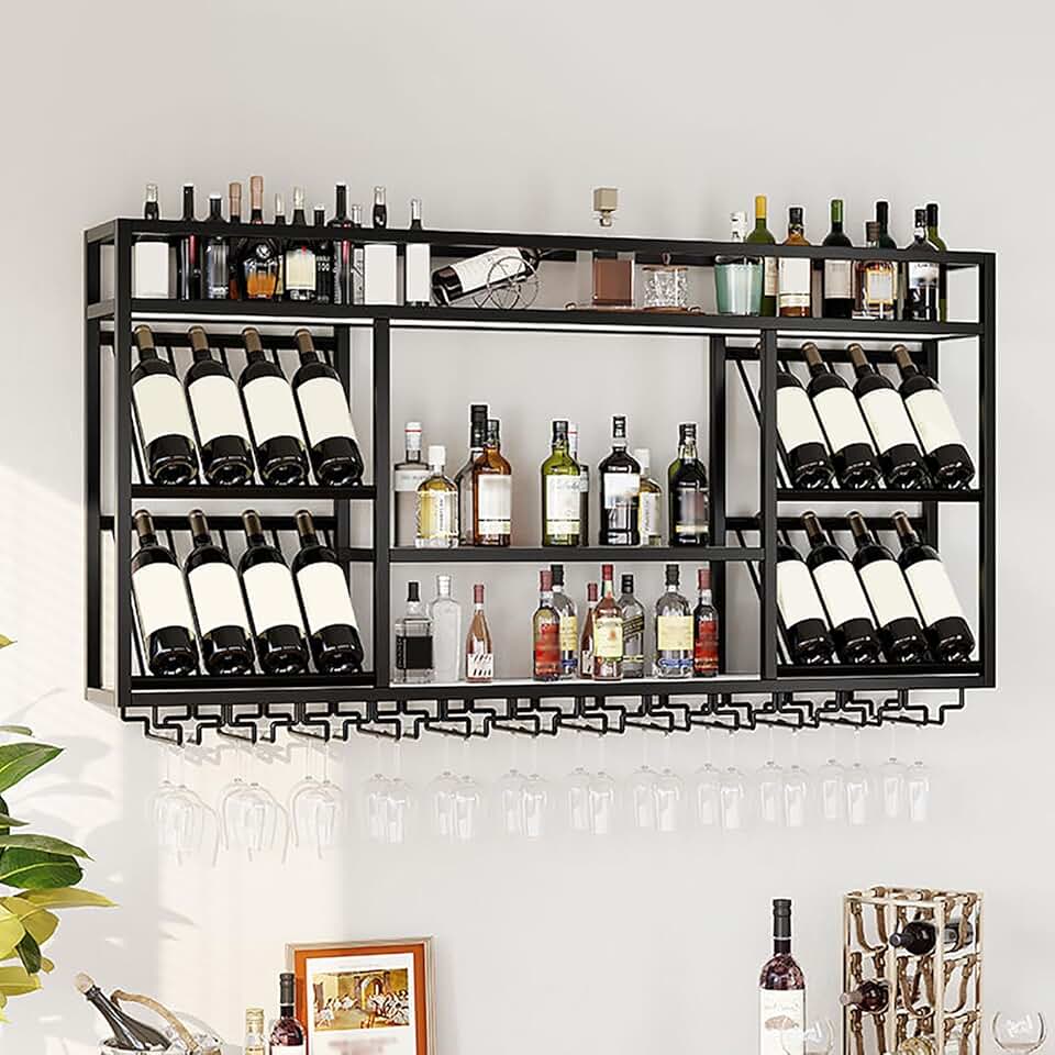 Wall Mounted Wine Racks with Glass Holder, 3 Tier Wine Storage Display Rack, Floating Rustic Metal Bar Liquor Shelves, for Home Bar, Wine Kitchen Storage (Black, 39.37x27.55x9.8in)