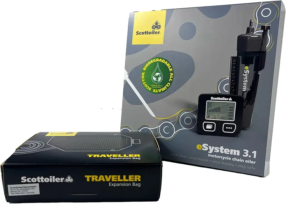 Scottoiler eSystem Electronic Automatic Motorcycle Chain Lubrication System with Biodegradable Green Scottoil & Traveller Expansion Bag Range Extending Touring Bundle…