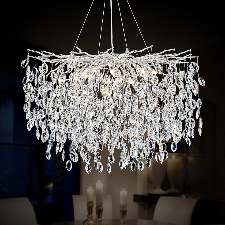 D31.5 inch Silver Ceiling Hanging Crystal Chandelier Lighting, Luxury Round Pendant Light Fixture for Living Room, Foyer, Dining Room Over Dining Table, Kitchen Island