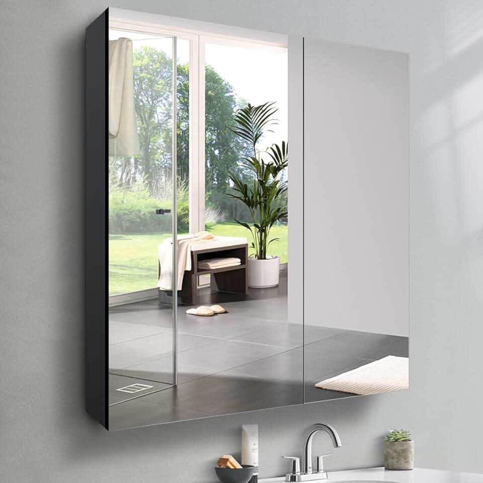 Double Doors Modern Medicine Cabinet Mirror for Bathroom 80 x 70 CM Wall-Mounted Mirror Cabinet Black Aluminum Medicine Cabinet with Mirrored Doors Black Mirrored Bath Cabinet
