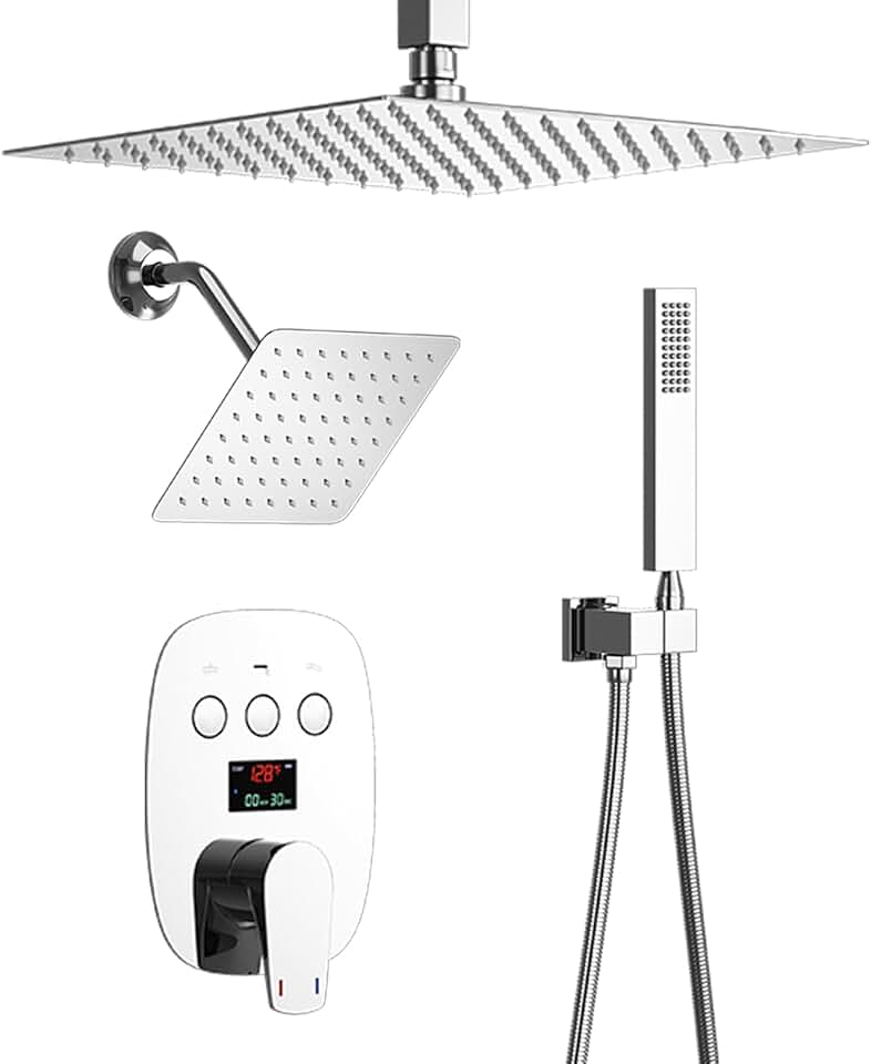 Rainfall Dual Head Shower System Chrome Shower Faucet Set with 12 and 8 inch Shower Head and Handle Set, Water Temperature Display Shower Valve and Trim Kit Functions Can Run At A Time