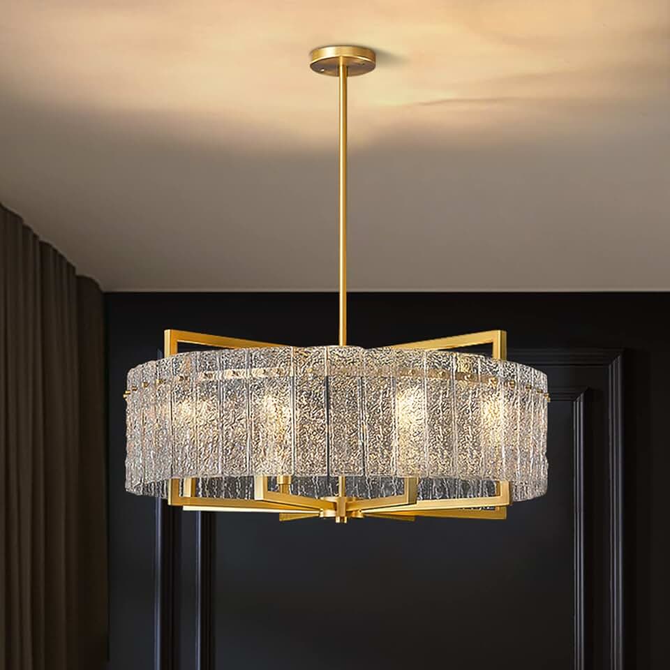6-Light Modern Round Chandelier, Luxury Gold Drum Chandeliers, Water Ripple Glass Pendant Lighting Fixture for Dining Room Kitchen Island Bedroom Hotel Dia 25.6 Inches