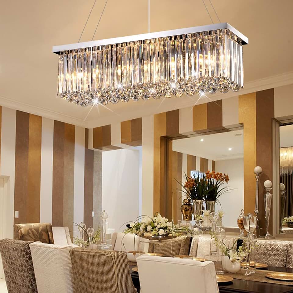 Modern Silver Rectangular Crystal Chandelier, Dining Room Chandeliers Over Table, Luxury Chrome Pendant Ceiling Light Fixtures for Kitchen Island, Living Room, Bar of CRYSTOP