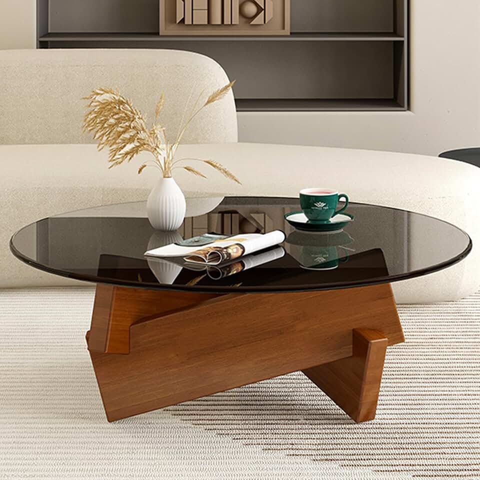 Coffee Table, Round Coffee Table for Living Room Modern Glass Coffee Table with Solid Wood Legs Farmhouse Mid Century Center Table Large Circle Cocktail Table (Walnut + Gray, 31.5in)