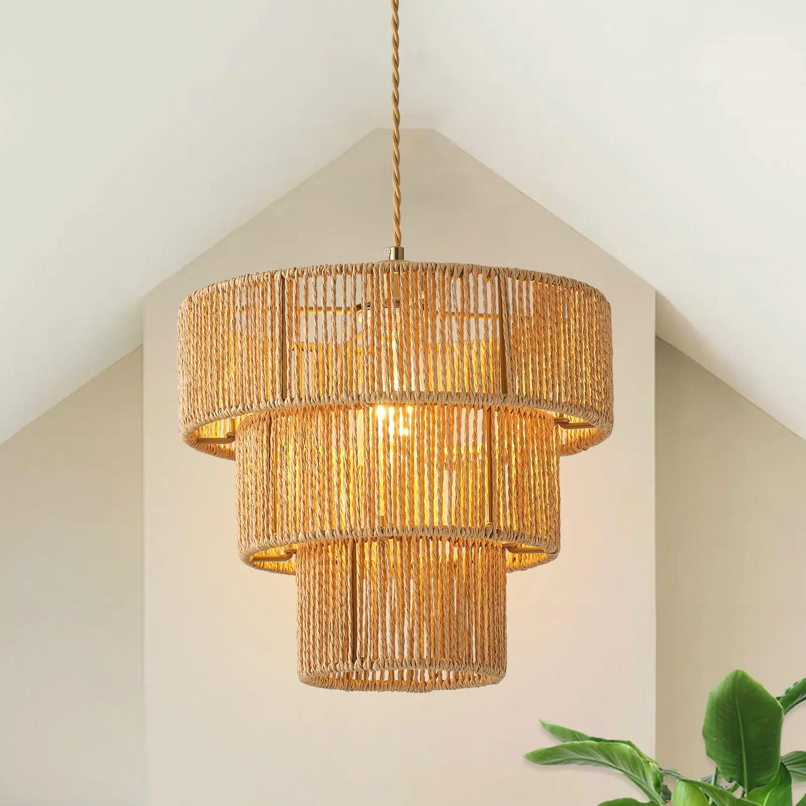 Starsky 1-Light Modern Bohemian Tiered Ceiling Light Drum Chandelier with Natural Handmade Rope Paper Shade