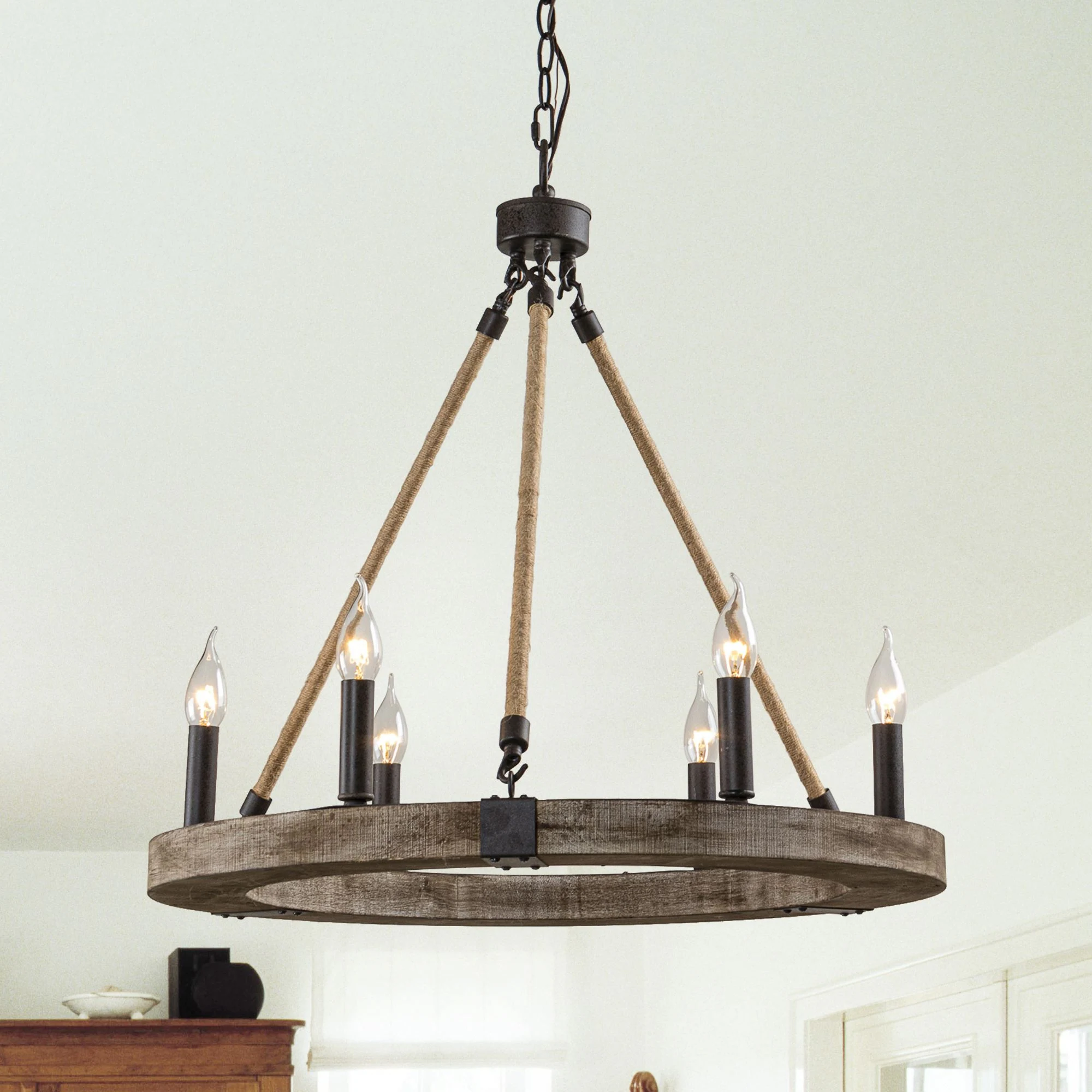 26" Wide Distressed Wood 6-Light Wagon Wheel Chandelier