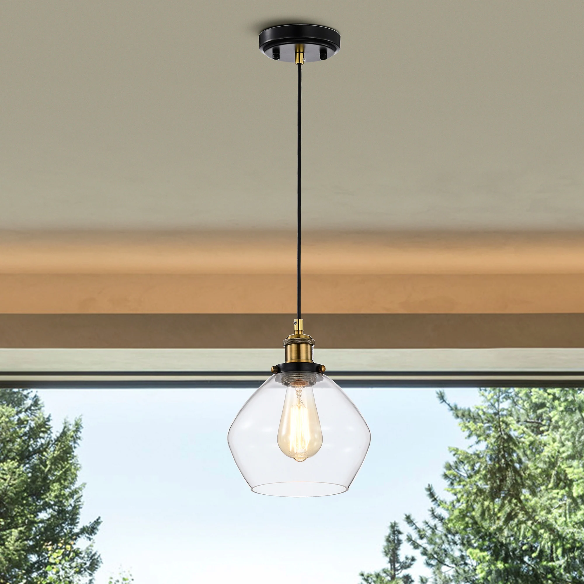 Black and Antique Brass 1-Light 8 Inch Pendant with Clear Glass Shade