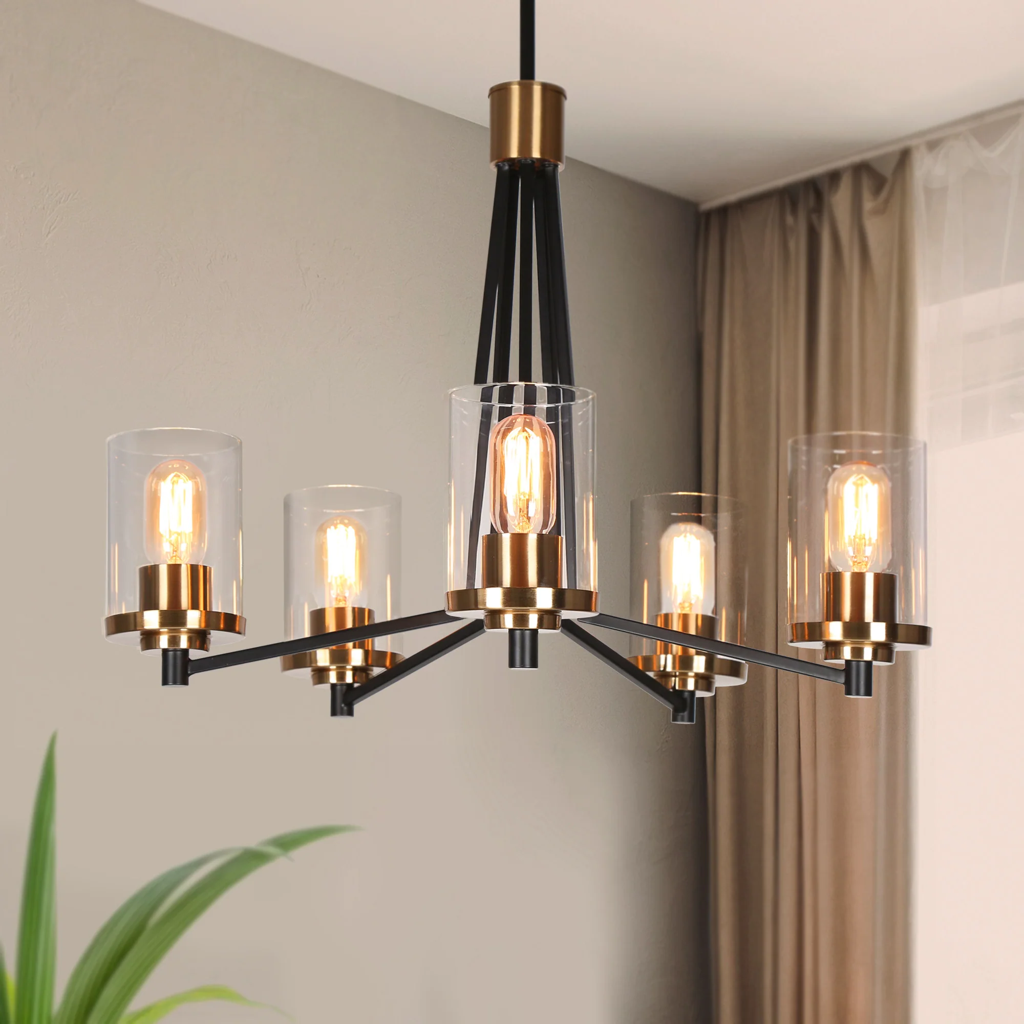 Modern Glam 5-Light Black Gold Chandelier Dining Room Chandelier with Cylinder Glass
