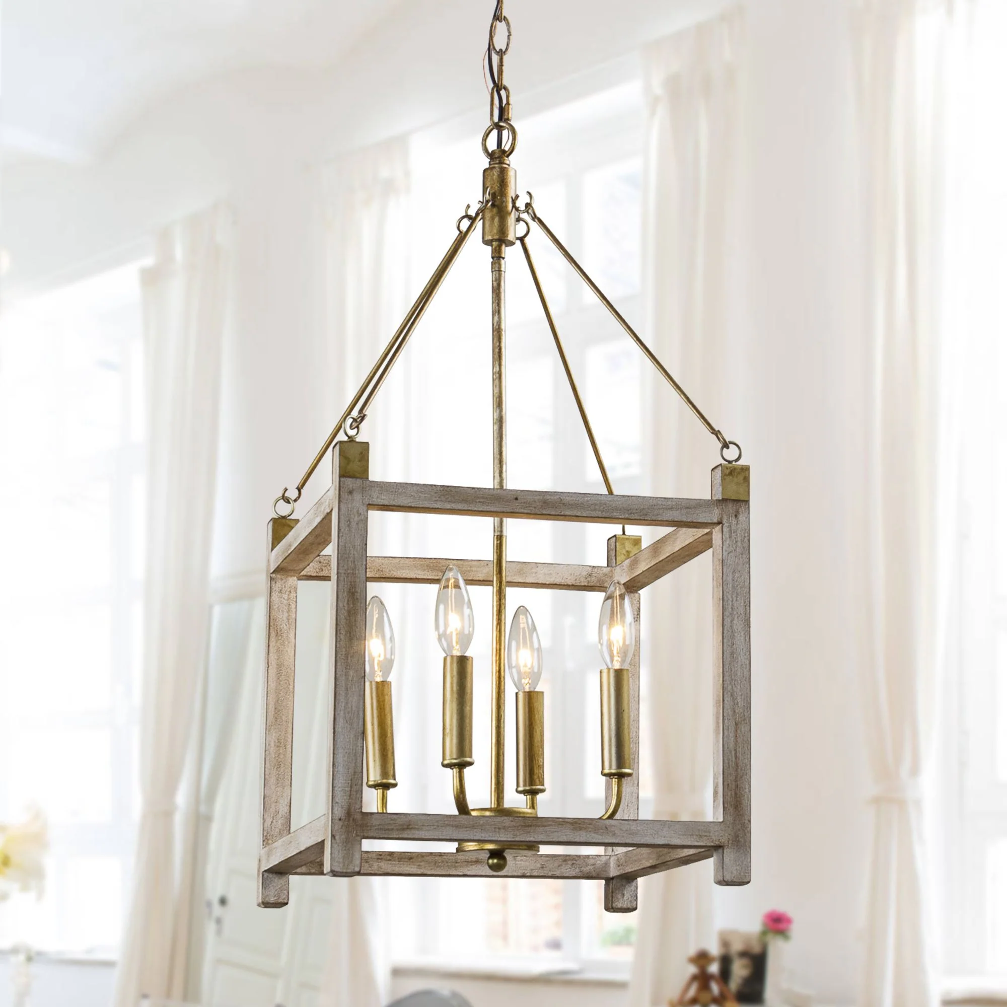 13.8" Farmhouse Gold/ White Wood 4-Light Square Lantern Chandelier