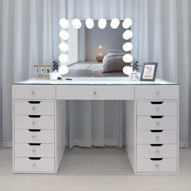 VANITII 13 Drawers Makeup Vanity Desk Come With 14 LED Bulbs Bluetooth Mirror White Finish Bedroom Dressers