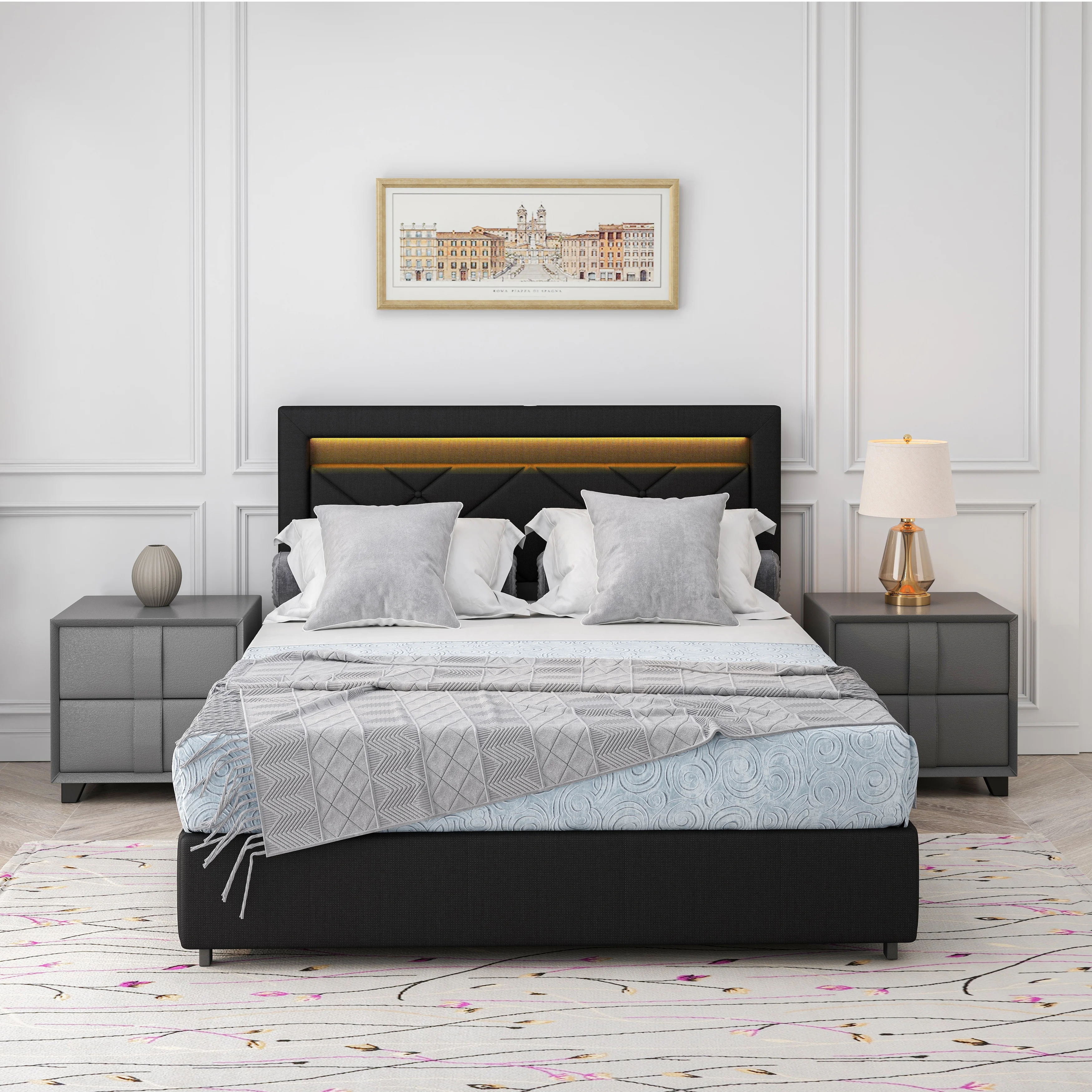 Queen Size Bed Frame with LED Lights and USB Charging Station