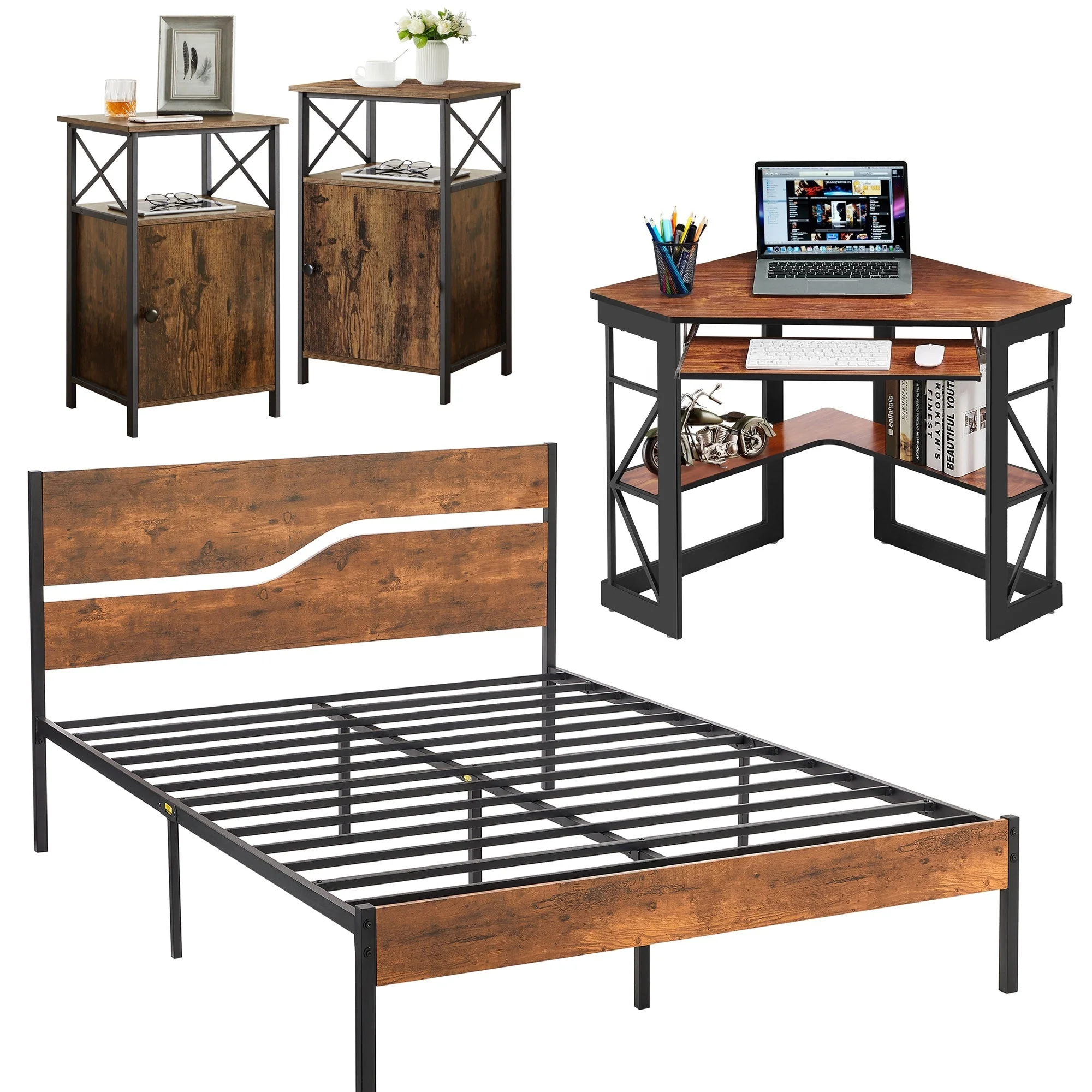 VECELO 4-Pieces Bedroom Set, Bed Frame with Nightstand Set of 2 and Triangle Corner Desk