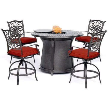 Hanover Traditions 5-Piece High-Dining Set in Red with 4 Swivel Chairs | 48" Round Cast Top Fire Pit Table | 40,000 BTU | TRAD5PCFPRD-BR-R